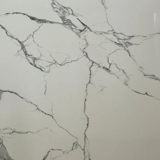 A whimsical marblelook Calacatta quartz that includes a cool white background with cloud-like soft gray veining that effortlessly floats across the slab. With very little care required, the pattern of this marble-style surface will remain pristine over the years.